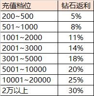例:单日充值200元,可获得5%的钻石返利,也就是1000钻石